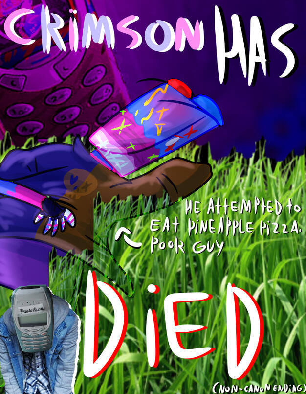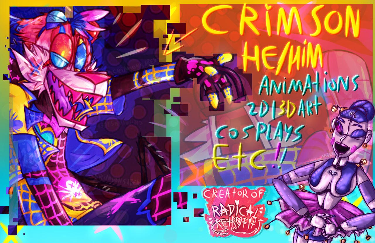 Heya! Im Crimson, more commonly known as Crimsonsaber and im a creative fella here to be silly and stay groovy (If not radical enough for you, fix it by yelling PHONE MEN into his asks ๐ฅฐ)He/HimArtist/Animator/ETCCreator of Radical Retrofit!
